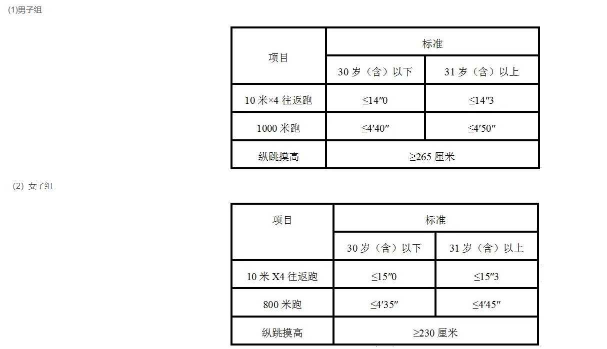 3.參照《關(guān)于印發(fā)公安機關(guān)錄用人民警察體能測評項目和標(biāo)準(zhǔn)(暫行)的通知》(人社部發(fā)〔2011〕48號)的項目及測試規(guī)則,結(jié)合《公安民警體育鍛煉達(dá)標(biāo)手冊》成績標(biāo)準(zhǔn),體能測評的項目和標(biāo)準(zhǔn)如下:
