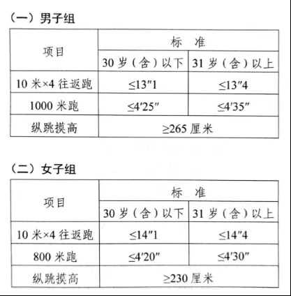 參照《公安機關(guān)錄用人民警察體能測評項目和標(biāo)準(zhǔn)》的項目及測試規(guī)則開展體能測評,本次體能測評的項目和標(biāo)準(zhǔn)如下: