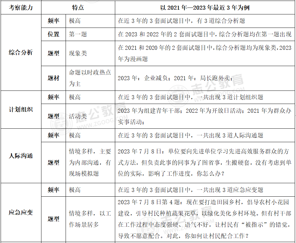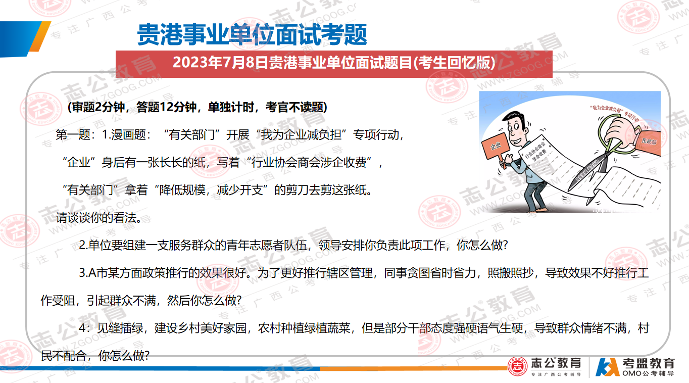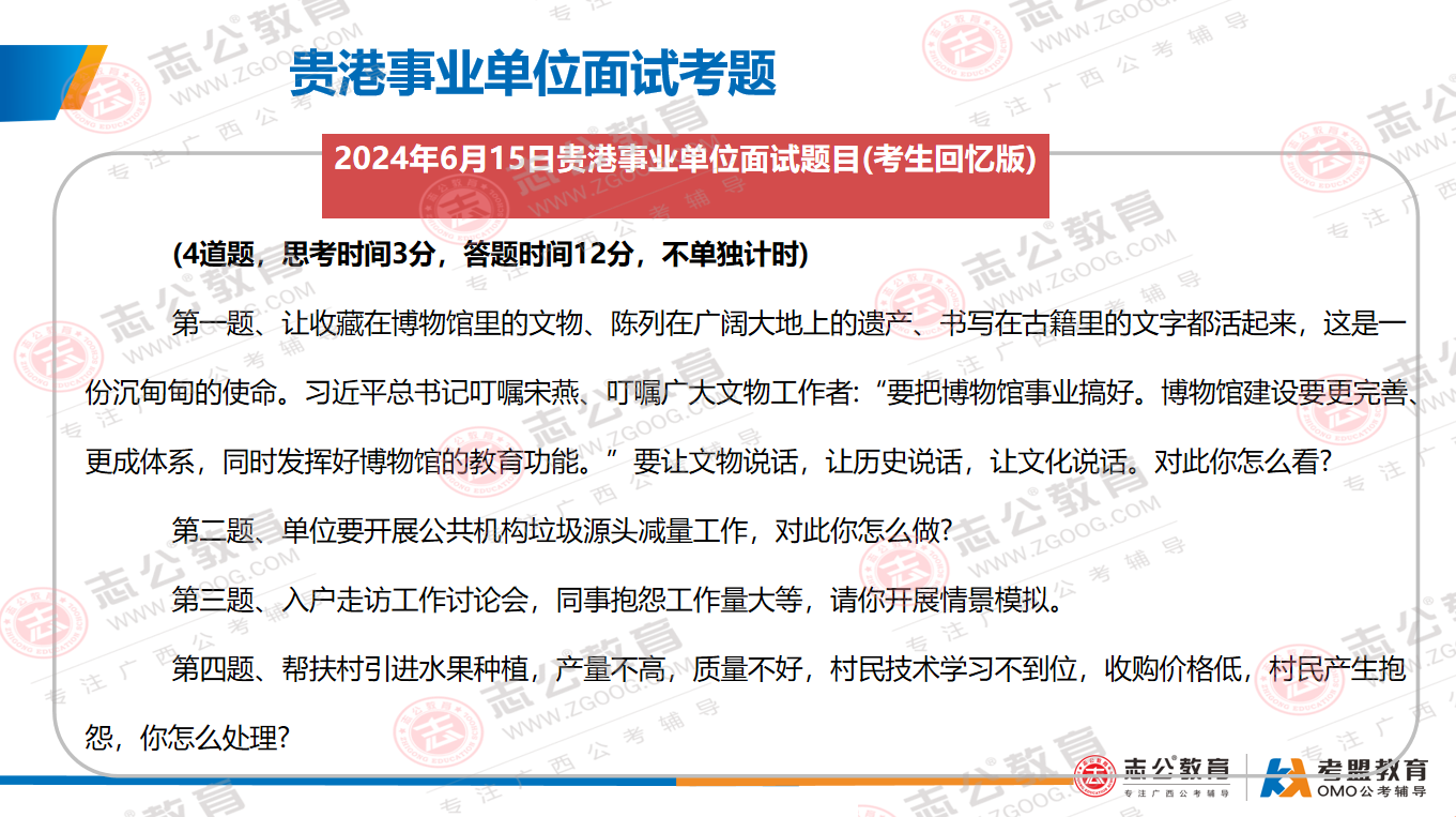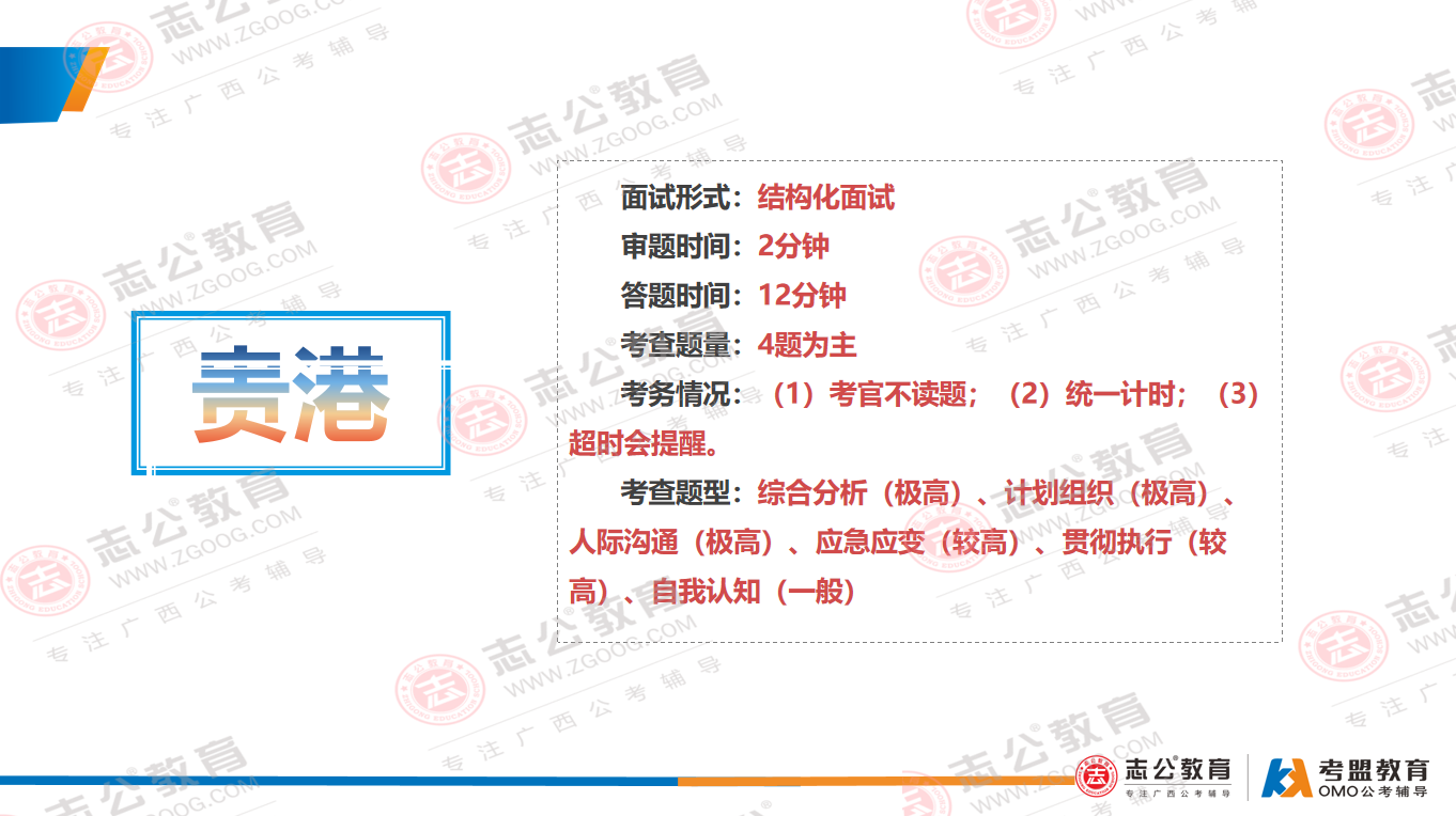 貴港事業(yè)單位面試主要采用結(jié)構(gòu)化面試形式;審題時間:2分鐘;答題時間:12分鐘;考查題量:4題為主??紕?wù)情況:考官不讀題、統(tǒng)一計時、超時會提醒。考查題型:綜合分析(極高)、計劃組織(極高)、人際溝通(極高)、應(yīng)急應(yīng)變(較高)、貫徹執(zhí)行(較高)、自我認知(一般)。