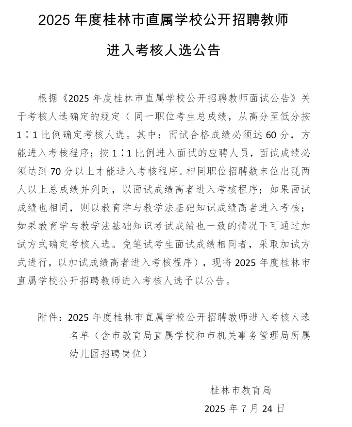 2025年度桂林市直屬學(xué)校公開(kāi)招聘教師進(jìn)入考核人選公告