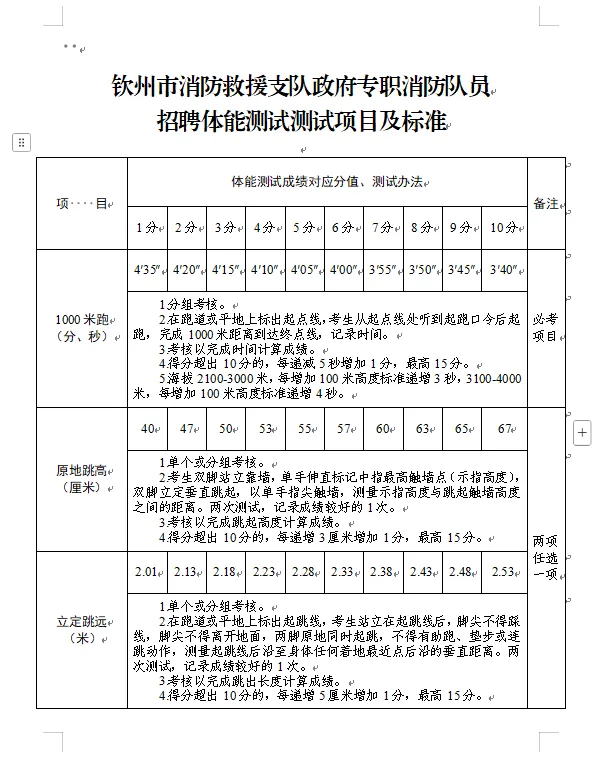 2.體能測試:(1)必考項目:1000米跑;(2)選考項目:①立定跳遠、原地跳高二選一;②單杠引體向上、俯臥撐二選一;③10米×4往返跑、100米跑二選一;(3)注意事項:應(yīng)聘人員須參加體能測試,并當(dāng)場簽訂《體能測試健康安全風(fēng)險承諾書》,體能測試有兩項及兩項以上不得分的視為不合格(標準參照附件)。未按時參加或因身體原因無法測試者,視為自動放棄。(體能測試測試項目及標準附后)